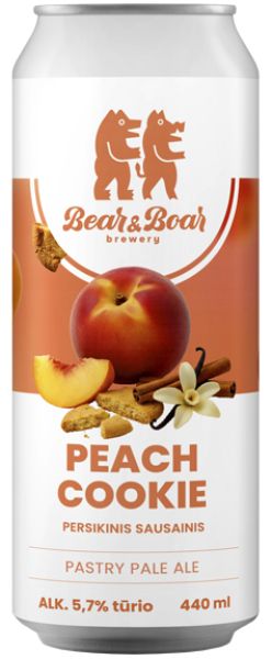 Bear&Boar Peach Cookie Pastry Pale Ale – tai švelniai vaisiškas ir kremiškas elis, primenantis persikinį desertą taurėje. Šis alus išsiskiria natūraliu persikų vaisiškumu, subtiliai papildytu vanilės ir cinamono prieskonių tonais, kurie suteikia šilumos ir jaukumo. Lengvas saldumas dera su vos juntamu apynių kartumu, o citrusų bei sakų natų užuomina išlaiko balansą ir gaivumą.