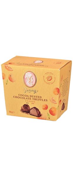 Triufeliai apelsinų skonio, apibarstyti kakava. Grynasis kiekis 170 g.