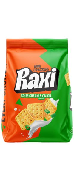 Raxi Sour Cream & Onion Mini Crackers – lengvi, traškūs mini krekeriai su grietinės ir svogūnų skoniu. Subalansuotas sūrumas, švelni grietinės nata ir aromatingas svogūno akcentas sukuria sodrų, bet neperkrautą skonio profilį, tinkantį įvairioms užkandžių situacijoms.