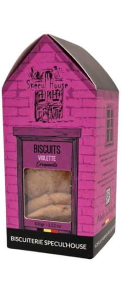 Violetinių saldainių 13,3% skonio sausainiai. Grynasis kiekis 100 g.